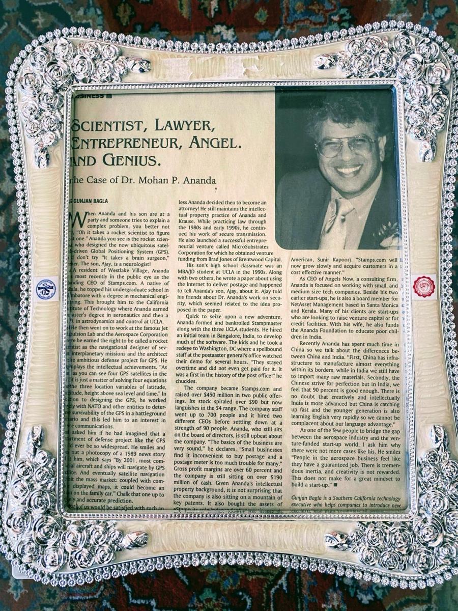 Mohan also created a Law Firm in 1986, Ananda and Krause, a California Law Corporation. Mohan’s primary area of interest was providing technical, management, intellectual property rights and other corporate legal advice to high tech startup and medium size companies. His clients also included large companies such as the Aerospace Corporation, JPL, IBM, GE, ITT and Loral. He primarily provided technical and management consulting to these large companies.