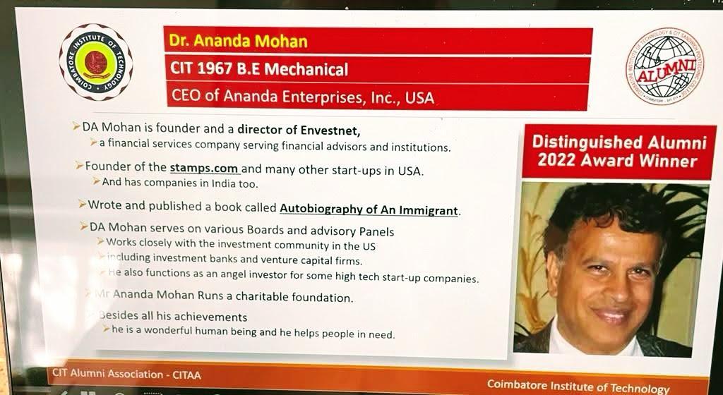 Mohan is also involved with a number of charitable activities in the US and in India through Ananda Foundation, Inc., a Charitable Foundation he has created under the laws of the US. Mohan functions as the CEO of Ananda Foundation and also as the Managing Director of Achuthan Nair and Easwari Amma Charitable Trust primarily for the purposes of charitable activities in India formed under the laws of India. Mohan is also working as the President of another charitable organization, Paanini Foundation, formed to help displaced employees by automation and developments in Artificial Intelligence. Mohan is also working with Stanford Seed Transformation Program organized by Stanford University through Stanford Institute for Innovation in Developing Economies as a Seed Consultant assisting companies in India in the areas of improving management, growth, marketing, finances and other related areas.